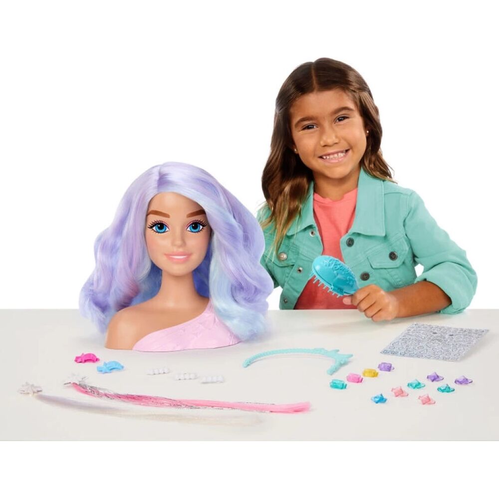 Barbie'nin pastel mavi ve lavanta tonlarında dalgalı fantazi saçları var. Büyüleyici updos ve örgülerden rengarenk dekore edilmiş görünümlere kadar, stil potansiyeli sınırsızdır.İki yıldızlı toka, üç inci toka, 11 değerli taş klips ve aydan ilham alan bir kafa bandı ile aksesuar haline getirin.
