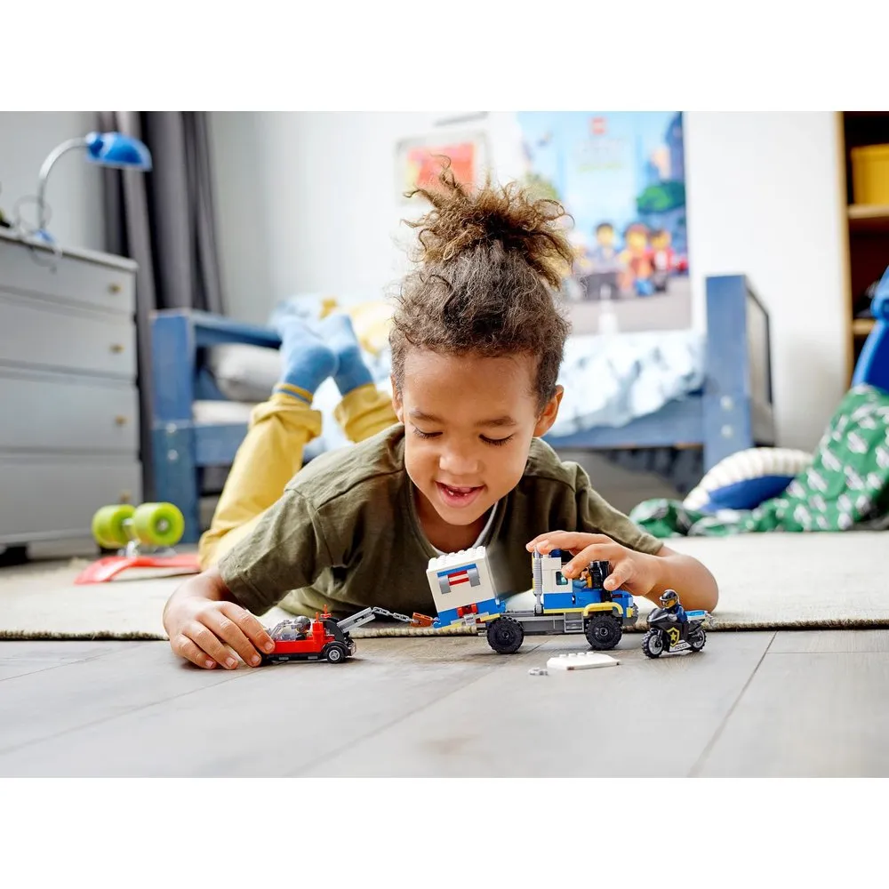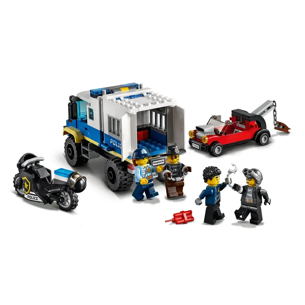 Kutuda ne var? Çocukların oyuncak bir mahkum nakliye aracı, bir çekici kamyon ve bir polis motosikleti yapması için gereken her şey, ayrıca LEGO® City TV'den Duke DeTain, Snake Rattler ve Suçlu Clara dahil 4 minifigür.